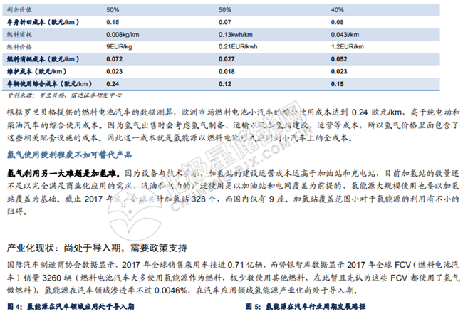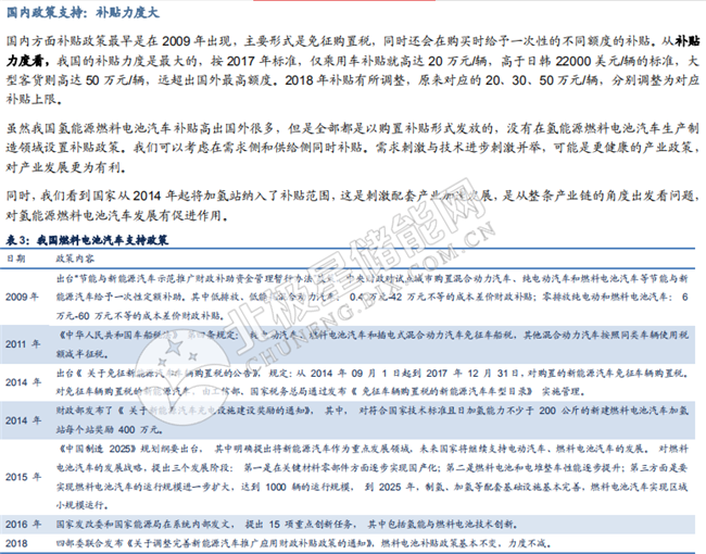 氫能源:綠色零排放,或是能源終極形式。從歷史變遷的縱向角度看,人類利用能源的發(fā)展歷史是不斷走向清潔化的過程,氫能源是目前已知最綠色清潔的能源,其反應(yīng)產(chǎn)物只有水, 因此有望成為能源的終極形式。從橫向?qū)Ρ冉嵌瓤?,氫能源相較于其他形式的能源具有功率密度優(yōu)勢,在發(fā)電領(lǐng)域具有建設(shè)成本優(yōu)勢。目前氫能源應(yīng)用的主要阻礙在于分布式應(yīng)用場景利用綜合成本高,并且氫氣使用的便利性和其他能源相比有較大差距。以全球氫能源乘用車發(fā)展為例,氫能源產(chǎn)業(yè)化應(yīng)用尚處于導(dǎo)入期,需要政策支持。我們認(rèn)為,在各國產(chǎn)業(yè)政策及補貼的推動下,氫能源產(chǎn)業(yè)發(fā)展有向好趨勢,國內(nèi)市場也有望真實進入導(dǎo)入期,但產(chǎn)業(yè)鏈仍需完善。