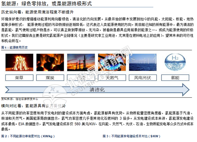 氫能源:綠色零排放,或是能源終極形式。從歷史變遷的縱向角度看,人類利用能源的發(fā)展歷史是不斷走向清潔化的過程,氫能源是目前已知最綠色清潔的能源,其反應(yīng)產(chǎn)物只有水, 因此有望成為能源的終極形式。