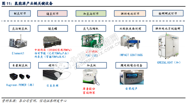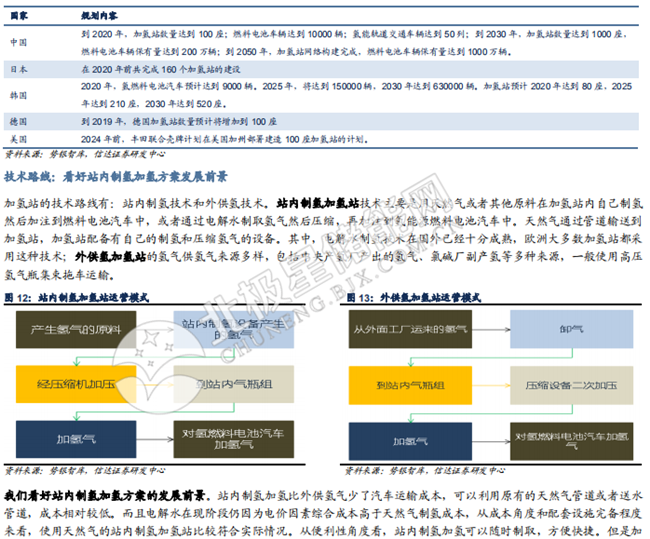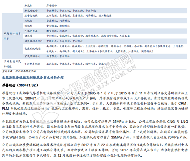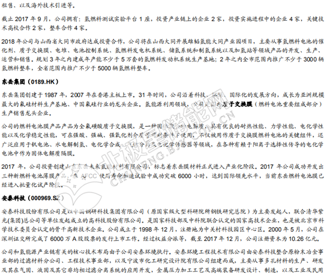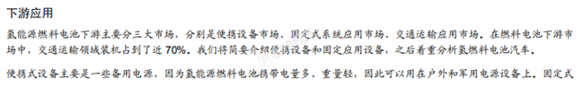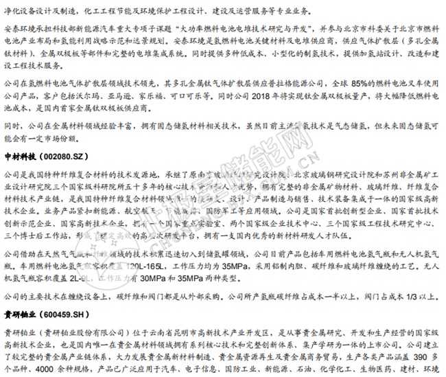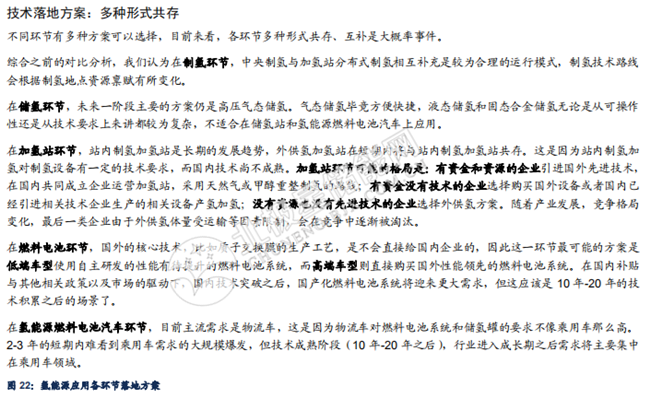 氫能源產(chǎn)業(yè)鏈:日益完善,整裝待發(fā)。氫能源產(chǎn)業(yè)鏈包括上游制氫產(chǎn)氫、氫氣儲存運輸、加 氫站運營、中游燃料電池系統(tǒng)及零部件生產(chǎn)制造、下游氫燃料電池應(yīng)用等眾多環(huán)節(jié)。同時, 圍繞氫氣展開的主產(chǎn)業(yè)鏈條需要大量高技術(shù)含量機械設(shè)備支持,主要集中在制氫和壓縮領(lǐng)域。我們認(rèn)為,制氫路徑會按照制氫地的資源稟賦不同而有所變化,儲氫環(huán)節(jié)主要還是氣態(tài)儲氫,但合金儲氫前景較好,加氫站環(huán)節(jié)會呈現(xiàn)中央制氫與分布式制氫共存互補的格局,燃料電池環(huán)節(jié)的機會在于質(zhì)子交換膜、低成本催化劑以及儲氫瓶,下游應(yīng)用環(huán)節(jié)中汽車市場最大,汽車應(yīng)用市場中,我們預(yù)計氫燃料電池商用車市場最先爆發(fā)。