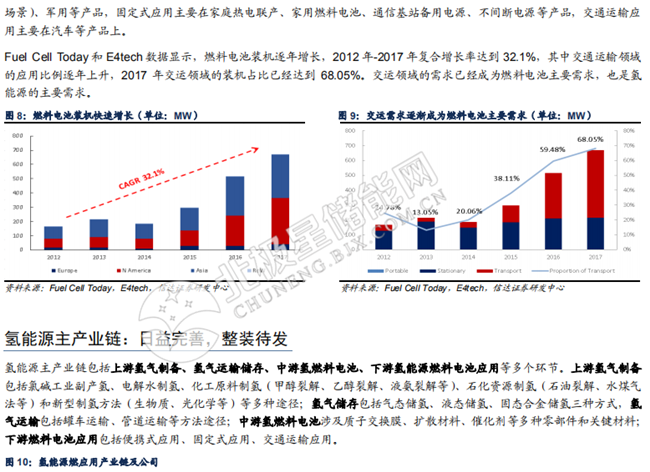 從氫能源非工業(yè)應(yīng)用看:燃料電池是使用氫能源的理想方式,下游交通運輸需求漸成主流。氫能源應(yīng)用有多種方式,可以通過傳統(tǒng)熱機也可以通過燃料電池。由于燃料電池跳出了熱循環(huán)的限制,因而具有更少的能量損失,能量利用效率更高。同時,燃料電池利用氫能源具有噪音小等優(yōu)點。因此燃料電池是氫能源利用的理想形式。氫能源燃料電池下游有便攜設(shè)備、固定式應(yīng)用和交通運輸式應(yīng)用,據(jù)國外研究機構(gòu) Fuel Cell Today 和E4tech 數(shù)據(jù)顯示,交通運輸裝載的氫燃料電池量逐年增長,2017 年全球燃料電池裝機中,交通運輸需求占比 68.05%。交運需求已經(jīng)成為燃料電池的主要需求,也是氫能源非工業(yè)應(yīng)用的主要需求。