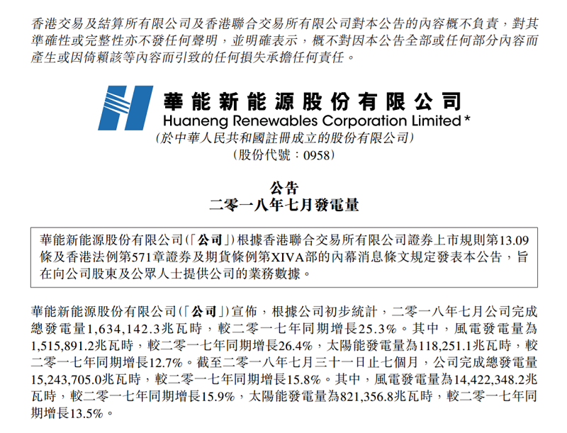 華能新能源7月風(fēng)電發(fā)電量為15.16億度 較2017年同期增長(zhǎng)26.4%