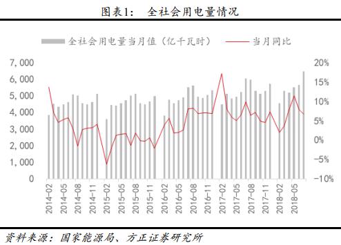 7 月用電量增速 6.8%,較上月增速環(huán)比降低 1.2 個(gè)百分點(diǎn),已連續(xù) 2 個(gè)月出現(xiàn)環(huán)比下降,其中二產(chǎn)、三產(chǎn)和居民用電量增速分別環(huán)比變化-2、-2 和+5.2 個(gè)百分點(diǎn)。7 月用電增速環(huán)比下滑或因工業(yè)生產(chǎn)用電需求降低所致,2018 年 7 月份,規(guī)模以上工業(yè)增加值同比實(shí)際增長(zhǎng) 6.0%,與 6 月份持平,為近一年最低水平,較去年 7 月 6.4%的增速下滑 0.4 個(gè)百分點(diǎn)。居民用電增速環(huán)比大增,主要因?yàn)?7 月全國(guó)平均氣溫較常年同期偏高 1℃,甘肅、湖北、吉林、遼寧、山東等地多發(fā)極端高溫天氣,帶動(dòng)居民用電需求增加較多。