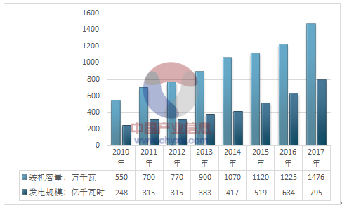 2010-2017年我國生物質(zhì)發(fā)電裝機(jī)容量及發(fā)電規(guī)模走勢圖