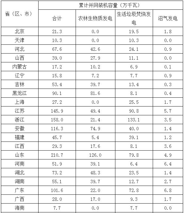 在各種政策的支持下,我國在生物質(zhì)能發(fā)電領(lǐng)域取得了重大進(jìn)展。截至2017年底,全國共有30個(gè)省(區(qū)、市)投產(chǎn)了747個(gè)生物質(zhì)發(fā)電項(xiàng)目,并網(wǎng)裝機(jī)容量1476.2萬千瓦(不含自備電廠),年發(fā)電量794.5億千瓦時(shí)。其中農(nóng)林生物質(zhì)發(fā)電項(xiàng)目271個(gè),累計(jì)并網(wǎng)裝機(jī)700.9萬千瓦,年發(fā)電量397.3億千瓦時(shí);生活垃圾焚燒發(fā)電項(xiàng)目339個(gè),累計(jì)并網(wǎng)裝機(jī)725.3萬千瓦,年發(fā)電量375.2億千瓦時(shí);沼氣發(fā)電項(xiàng)目137個(gè),累計(jì)并網(wǎng)裝機(jī)50.0萬千瓦,年發(fā)電量22.0億千瓦時(shí)。生物質(zhì)發(fā)電累計(jì)并網(wǎng)裝機(jī)排名前四位的省份是山東、浙江、江蘇和安徽,分別為210.7萬、158.0萬、145.9萬和116.3萬千瓦;年發(fā)電量排名前四位的省份是山東、江蘇、浙江和安徽,分別是106.5億、90.5億、82.4億和66.2億千瓦時(shí)。