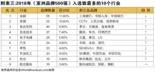 本年度《亞洲品牌500強》排行榜中,共有來自金融、傳媒、食品飲料、信息技術、零售、汽車和石油化工等在內的40個相關行業(yè)的品牌入選。其中金融是入選品牌最多的行業(yè),共有58個品牌入選,入選數(shù)量其次的行業(yè)分別是傳媒、食品飲料、信息技術、電子電器、汽車、零售。