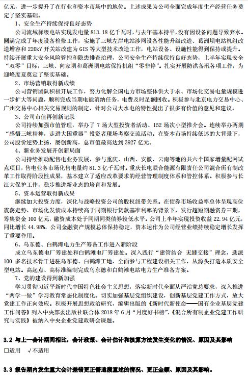 日前,中國(guó)長(zhǎng)江電力股份有限公司發(fā)布2018 年半年度報(bào)告:上半年,面對(duì)電力消納形勢(shì)嚴(yán)峻,資本市場(chǎng)走勢(shì)低迷等多重不利因素,公司上下深入學(xué)習(xí)貫徹習(xí)近平總書(shū)記考察三峽工程重要講話精神,狠抓安全生產(chǎn),努力發(fā)揮梯級(jí)調(diào)度效益,梯級(jí)電站累計(jì)發(fā)電 813.18 億千瓦時(shí),安全生產(chǎn)保持了良好態(tài)勢(shì),利潤(rùn)總額首次突破百億大關(guān),達(dá) 102.16 億元,同比增長(zhǎng) 5.09%,首次突破百億元大關(guān),創(chuàng)歷史最好水平;公司市值創(chuàng)歷史新高超過(guò) 3900 億元,進(jìn)一步提升了在行業(yè)和資本市場(chǎng)中的地位。上述成果為公司全面完成年度生產(chǎn)經(jīng)營(yíng)任務(wù)奠定了堅(jiān)實(shí)基礎(chǔ)。