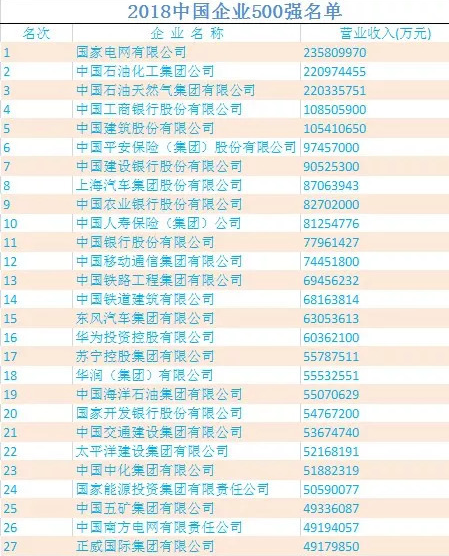 2018中國企業(yè)500強(qiáng)榜單出爐:國家電網(wǎng)蟬聯(lián)榜首