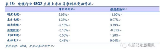 凈利率方面,18年二季度6家公司中有2家凈利率同比上升,其余四家同比都有所下降,但環(huán)比來看改善都很明顯,僅有漢纜股份一家環(huán)比下降。