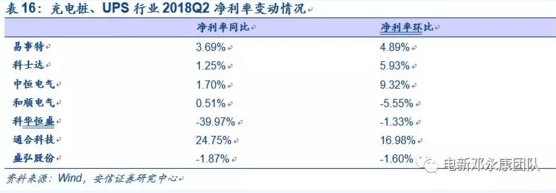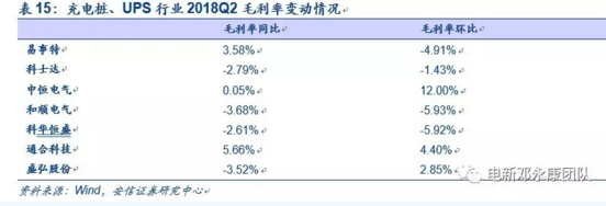 在充電樁和UPS業(yè)務(wù)方面共統(tǒng)計了7家上市公司,包括易事特、科士達、中恒電氣、和順電氣、科華恒盛、通合科技和盛弘股份。行業(yè)整體在2018Q2實現(xiàn)營收42.02億元,同比略下降0.52%,環(huán)比增長80.5%。上半年累計營收65.3億元,較去年同期增長4.18%。由前幾年單季度情況推測,18年下半年營收仍可保持同比增長,Q4達到全年最高點。此外,行業(yè)在2018Q2的歸母凈利潤為4.81億元,同比減少24.96%,源于17年Q2基數(shù)大,環(huán)比增長161.41%。上半年,累計實現(xiàn)歸母凈利潤6.65億元,同比下降19.98%。