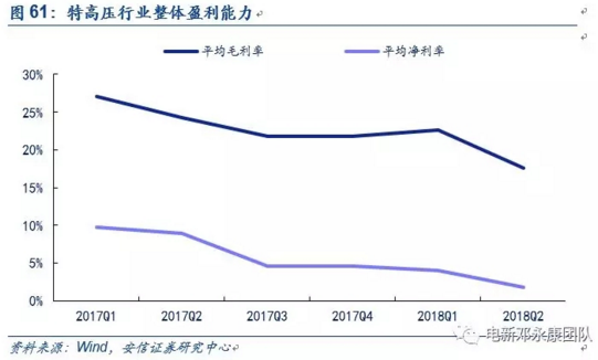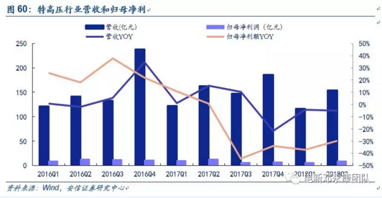 特高壓行業(yè)主要包括3家上市公司(中國西電、特變電工、平高電氣)。在2018年Q2,共實現(xiàn)營收153.93億元,同比下降5.14%;實現(xiàn)歸母凈利潤9.04億元,同比下降29.7%。從上半年度看,營收總計270.52億元,同比下降4.79%;歸母凈利潤總計15.48億元,同比下降32.9%。從前兩年單季表現(xiàn)看,預(yù)計18Q3營收環(huán)比下降,Q4會較大幅度回升。