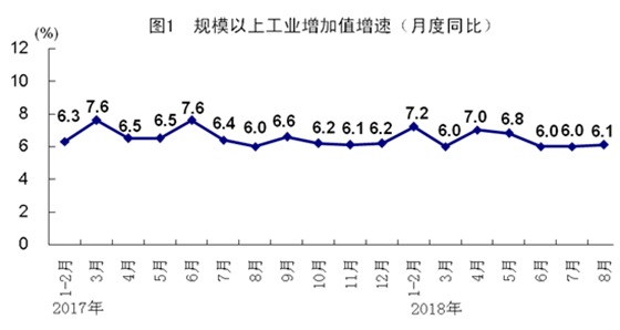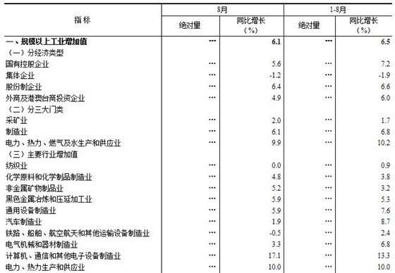 8月份,全國規(guī)模以上工業(yè)增加值同比實際增長6.1%,增速比上月加快0.1個百分點;1-8月份,全國規(guī)模以上工業(yè)增加值同比增長6.5%,增速比1-7月份回落0.1個百分點。分經(jīng)濟類型看,8月份,國有控股企業(yè)增加值同比增長5.6%,集體企業(yè)下降1.2%,股份制企業(yè)增長6.4%,外商及港澳臺商投資企業(yè)增長4.9%。分三大門類看,8月份,采礦業(yè)增加值同比增長2.0%,制造業(yè)增長6.1%,電力、熱力、燃氣及水生產(chǎn)和供應業(yè)增長9.9%。工業(yè)發(fā)展繼續(xù)邁向中高端。1-8月份,高技術(shù)制造業(yè)、裝備制造業(yè)和戰(zhàn)略性新興產(chǎn)業(yè)同比分別增長11.9%、8.8%和8.8%,分別快于規(guī)模以上工業(yè)5.4、2.3和2.3個百分點。工業(yè)新產(chǎn)品快速成長。1-8月份,新能源汽車、工業(yè)機器人、集成電路產(chǎn)量同比分別增長56.0%、19.4%和13.4%。企業(yè)利潤較快增長。1-7月份,全國規(guī)模以上工業(yè)企業(yè)實現(xiàn)利潤總額39038億元,同比增長17.1%;主營業(yè)務收入利潤率為6.46%,比上年同期提高0.4個百分點。