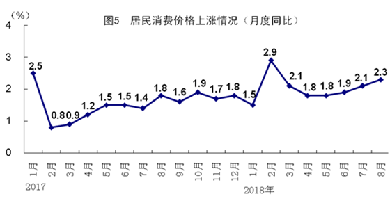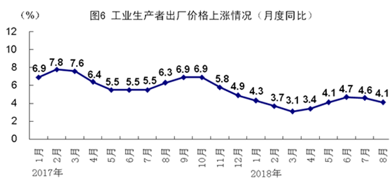 8月份,全國居民消費價格同比上漲2.3%,漲幅比上月擴大0.2個百分點,環(huán)比上漲0.7%。分類別看,食品煙酒價格同比上漲1.9%,衣著上漲1.3%,居住上漲2.5%,生活用品及服務上漲1.6%,交通和通信上漲2.7%,教育文化和娛樂上漲2.6%,醫(yī)療保健上漲4.3%,其他用品和服務上漲1.2%。1-8月份,全國居民消費價格同比上漲2.0%。8月份,全國工業(yè)生產(chǎn)者出廠價格同比上漲4.1%,漲幅比上月回落0.5個百分點,環(huán)比上漲0.4%;工業(yè)生產(chǎn)者購進價格同比上漲4.8%,環(huán)比上漲0.5%。1-8月份,全國工業(yè)生產(chǎn)者出廠價格同比上漲4.0%,工業(yè)生產(chǎn)者購進價格同比上漲4.5%。
