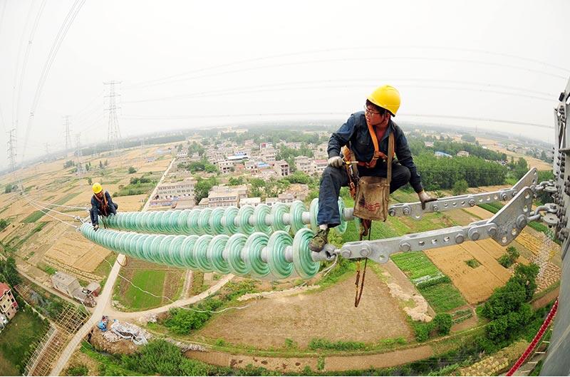 【背景】 在安徽省淮南市洛河鎮(zhèn)境內(nèi),安徽送變電工程公司施工人員在70多米高空進行500千伏輸電線路開斷施工?! ‘斎?,由安徽送變
