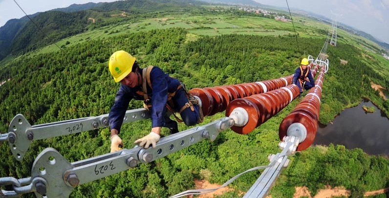 7月30日,在江西省高安市獨(dú)城鎮(zhèn)境內(nèi),幾名電力施工人員冒著高溫在70米高的特高壓輸電鐵塔上安裝附件。當(dāng)日,江西省高安市最高氣溫達(dá)到37攝氏度。400余名安徽送變電工程公司的施工人員頭頂烈日,堅(jiān)守在溪洛渡左