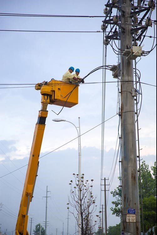 7月8日,宿遷遭遇今年以來最強(qiáng)雷暴雨,暴雨伴隨著雷電瞬間席卷全城,造成市區(qū)5條10千伏線路跳閘斷電,經(jīng)濟(jì)開發(fā)區(qū)大面積停電。宿遷供電公司第一時間作出反應(yīng),出動搶修隊伍進(jìn)行故障查詢,經(jīng)過連夜搶修,于9日凌晨全部恢復(fù)供電。圖為帶電作業(yè)車冒雨解除一被雷擊毀開關(guān)故障點(diǎn)。