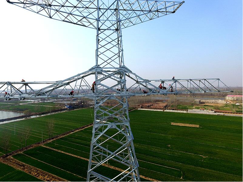 送變電工程公司技術(shù)人員在江蘇徐州銅山境的晉北-南京±800千伏特高壓直流輸電工程建設(shè)工地上組立鐵塔。