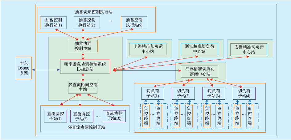 華東電網(wǎng)頻率緊急協(xié)調控制系統(tǒng)包括華東電網(wǎng)協(xié)控運行總站、多直流協(xié)調控制主站、抽蓄協(xié)調控制主站和精準負荷控制四大部分。華東電網(wǎng)協(xié)控運行總站、多直流協(xié)調控制主站和抽蓄切泵控制主站設置在±800 kV蘇州換流站,切負荷控制中心站設置在江蘇500 kV木瀆變。