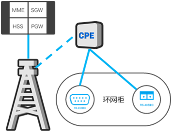 RTU、FTU、DTU、TTU等終端計(jì)量點(diǎn)可以通過RS232/RS485/FE等連接到CPE設(shè)備上,通過TD-LTE網(wǎng)絡(luò)進(jìn)行數(shù)據(jù)承載,完成和配電自動(dòng)化系統(tǒng)子站的通信。