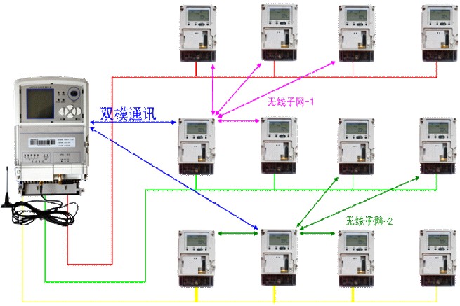 隨著全國(guó)范圍電網(wǎng)大改造的展開(kāi), 如何解決日益龐大的供電網(wǎng)絡(luò)自動(dòng)化管理問(wèn)題已迫在眉睫。利用低壓電力載波通信技術(shù)來(lái)傳輸用電數(shù)據(jù), 實(shí)現(xiàn)及時(shí)有效收集和統(tǒng)計(jì), 提高電力系統(tǒng)對(duì)供電質(zhì)量監(jiān)控能力和管理水平, 是目前國(guó)內(nèi)外公認(rèn)的一個(gè)最佳方案。低壓電力線(xiàn)是最為廣泛的一種通訊媒介網(wǎng)絡(luò), 采用合適技術(shù)充分用好這一現(xiàn)成的媒介, 使低壓電力線(xiàn)載波抄表系統(tǒng)達(dá)到實(shí)用化的需求, 所產(chǎn)生的經(jīng)濟(jì)效益和生產(chǎn)效率是顯而易見(jiàn)的。但由于低壓電力網(wǎng)結(jié)構(gòu)的復(fù)雜性、線(xiàn)路高頻信號(hào)衰減嚴(yán)重,特別是電網(wǎng)各種干擾的隨機(jī)性和無(wú)規(guī)律性,加上電力網(wǎng)絡(luò)的分布電容、分布電感、負(fù)載性質(zhì)、負(fù)載阻抗值、噪聲等都是動(dòng)態(tài)的而不是恒定的,電力載波技術(shù)具有一定的局限性。近年來(lái),隨著無(wú)線(xiàn)通信技術(shù)的發(fā)展,采用無(wú)線(xiàn)組網(wǎng)通信方式,其優(yōu)勢(shì)是非常明顯的,通信網(wǎng)絡(luò)與用電環(huán)境無(wú)關(guān),網(wǎng)絡(luò)穩(wěn)定可靠,網(wǎng)絡(luò)內(nèi)單一節(jié)點(diǎn)出現(xiàn)故障不會(huì)引起其他節(jié)點(diǎn)正常通信故障。為了提高抄表成功率采用電力線(xiàn)載波和無(wú)線(xiàn)組網(wǎng)通信方式兩條不同通信方式的互為備用的通信信道,充分結(jié)合載波與無(wú)線(xiàn)各自的優(yōu)點(diǎn)。采用雙模通訊集抄技術(shù),提高日抄表成功率達(dá)100%。