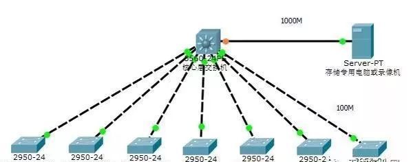 一般是幾個(gè)攝像頭共用一個(gè)交換機(jī)。與攝像頭直接相連的交換機(jī)可以使用百兆交換機(jī)。根據(jù)攝像頭地理分布決定幾個(gè)攝像頭連在一個(gè)交換機(jī)上。