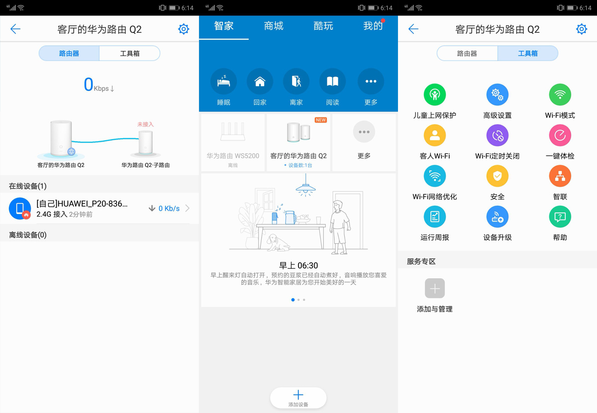 路由設(shè)置完成后,通過(guò)“智能家居”APP我們不僅可以了解子母路由的連接狀態(tài),接入設(shè)備的網(wǎng)絡(luò)使用情況,對(duì)華為路由Q2的工作模式進(jìn)行選擇,直接進(jìn)入商城購(gòu)買(mǎi)支持華為HiLink協(xié)議的智能家居產(chǎn)品并通過(guò)在APP內(nèi)進(jìn)行智能家居產(chǎn)品控制,或者瀏覽自己感興趣的酷玩資訊,還可以進(jìn)入工具箱,進(jìn)行遠(yuǎn)程管理、查看設(shè)備連接情況、設(shè)置Wi-Fi、設(shè)備限速、兒童上網(wǎng)保護(hù)、設(shè)置客人Wi-Fi、設(shè)置Wi-Fi定時(shí)開(kāi)關(guān)、一鍵診斷,等等更細(xì)化的操作,功能可以說(shuō)非常強(qiáng)大。