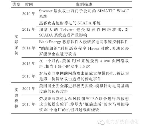 近年來,黑客或其他人員通過網(wǎng)絡(luò)攻擊手段侵入電網(wǎng)并最終實(shí)現(xiàn)對電力系統(tǒng)進(jìn)行破壞的事件頻發(fā)(詳見表1)。各國政府也逐漸開始重視網(wǎng)絡(luò)攻擊對本國電力系統(tǒng)的影響, 并通過模擬攻擊對網(wǎng)絡(luò)安全進(jìn)行自檢。針對電力系統(tǒng)的網(wǎng)絡(luò)攻擊一旦生效,將對系統(tǒng)穩(wěn)定、經(jīng)濟(jì)運(yùn)行, 甚至國民生計(jì)、社會(huì)安定產(chǎn)生嚴(yán)重影響。美國國防部高級(jí)研究計(jì)劃局(DARPA)近期就啟動(dòng)了一項(xiàng)名為“快速攻擊檢測、隔離和表征”的計(jì)劃,目標(biāo)是發(fā)展一套能夠應(yīng)對電網(wǎng)遭受針對信息網(wǎng)絡(luò)或基礎(chǔ)設(shè)施的摧毀性攻擊后7天內(nèi)恢復(fù)電力供應(yīng)的自動(dòng)化系統(tǒng)。