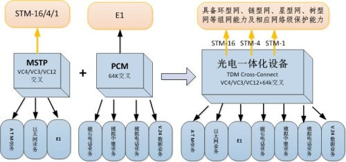 近年來推向市場的光電一體化設備,是針對電力行業(yè)實際業(yè)務需求出發(fā),在MSTP與PCM設備基礎上加以改進開發(fā)而成。其不僅具有PCM業(yè)務接入功能,支持64K時隙交叉,同時還提供TDM、以太網業(yè)務接入,支持MSTP高、低階交叉,系統(tǒng)側支持STM-16/4/1標準光接口。