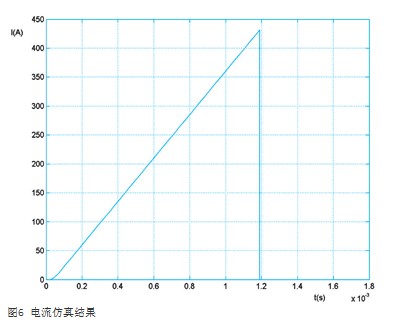 按照以上模型的建立和對(duì)相關(guān)參數(shù)的分析進(jìn)行仿真,仿真結(jié)果如圖6所示。實(shí)線表示在主接觸器流過的實(shí)際電流。我們控制器設(shè)定在電流300a時(shí)進(jìn)行過流保護(hù),斷開主接觸。但由于采集電流電路和過流故障執(zhí)行電路的延時(shí)原因?qū)е略陔娏?00a時(shí)不能及時(shí)的斷開主接觸器,而是在電流大概420a時(shí)才切斷高壓電路。這就在對(duì)主接觸器的選型時(shí)必須要考慮延時(shí)帶來的影響。
