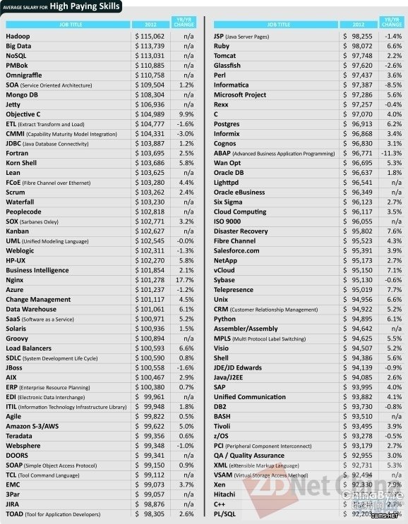 也許一些企業(yè)至今還未真正了解大數(shù)據(jù)的價(jià)值,但是卻并不影響他們?cè)陬愃艸adoop及NoSQL等大數(shù)據(jù)技能上的大筆投資。通過一個(gè)2013 Dice Tech Salary Survey了解到,大數(shù)據(jù)項(xiàng)目的兩個(gè)支柱(Hadoop及NoSQL)人才的價(jià)值高于其它任何技術(shù)技能,而Apple相關(guān)的技術(shù)落下的也并不是很遠(yuǎn),比如Omnigraffle及Objective-C。從榜單的數(shù)據(jù)來看,大數(shù)據(jù)無疑是硅谷最有價(jià)值產(chǎn)業(yè)之一。