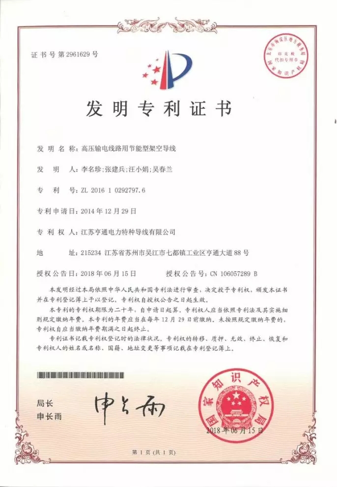 亨通高壓輸電線路用節(jié)能型架空導線等通過發(fā)明專利授權
