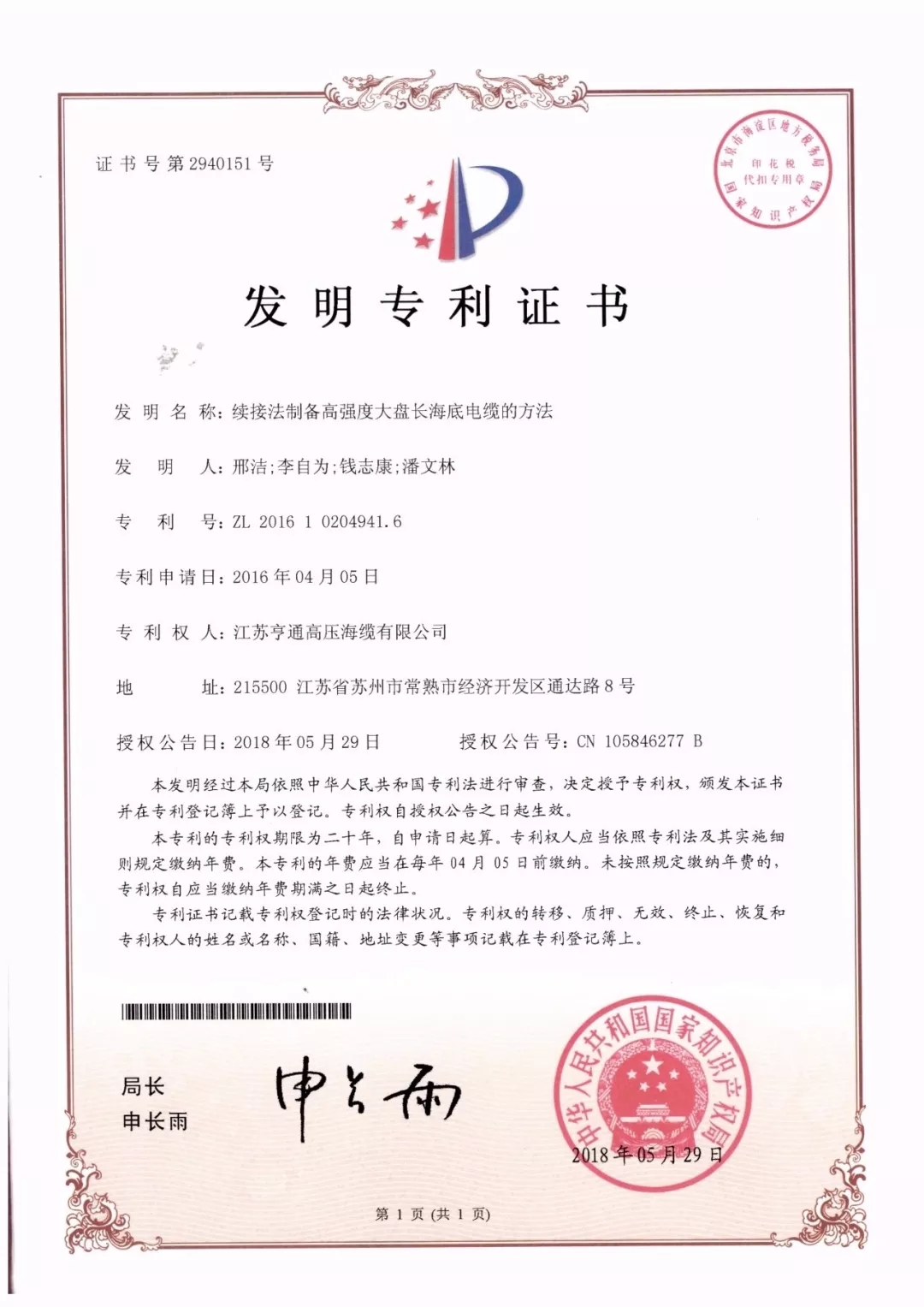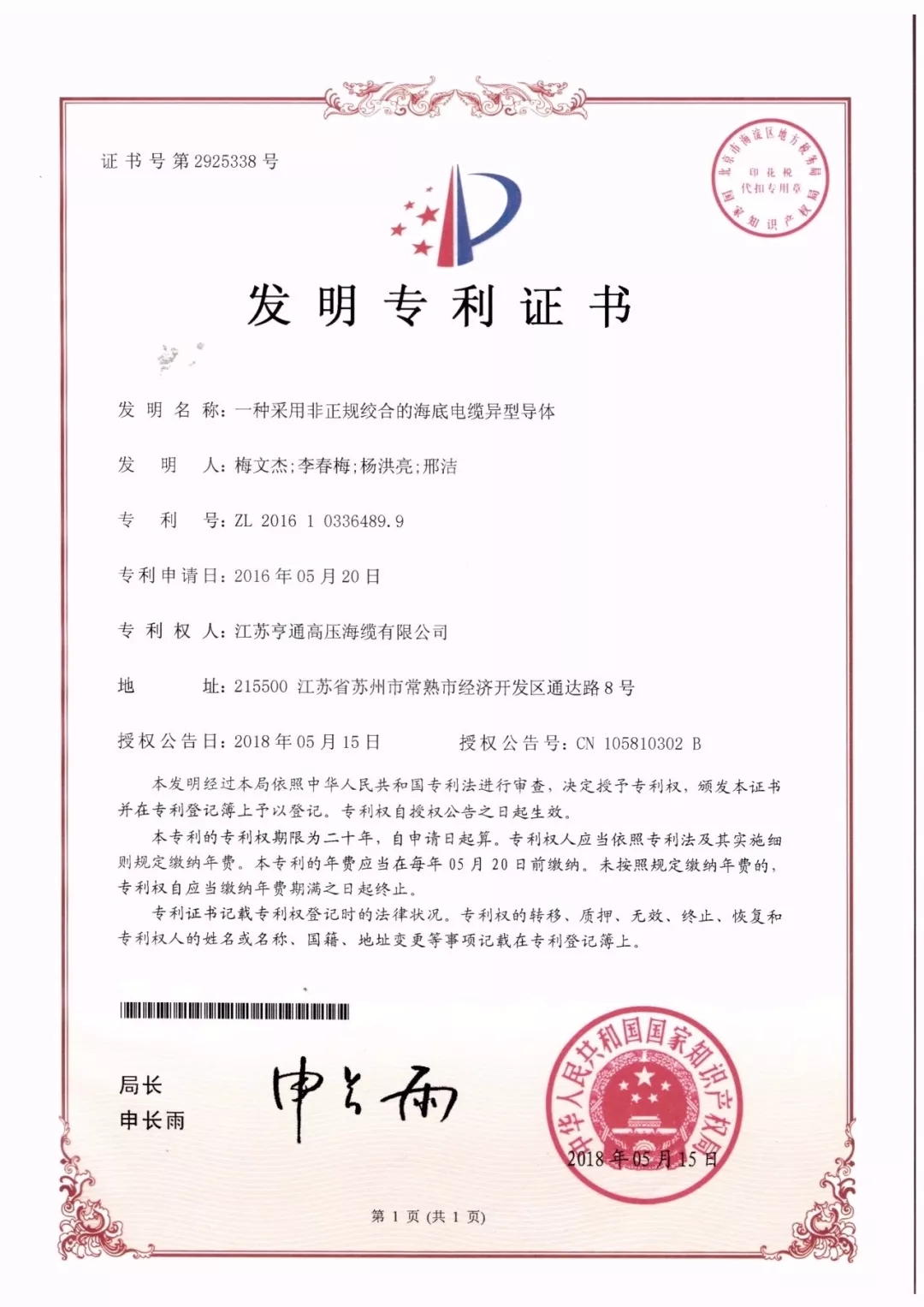 近日,亨通電力產業(yè)集團旗下江蘇亨通高壓海纜有限公司的“續(xù)接法制備高強度大盤長海底電纜的方法”、“一種采用非正規(guī)絞合的海底電纜異型導體”與江蘇亨通電力特種導線有限公司的“高壓輸電線路用節(jié)能型架空導線”紛紛成功通過國家知識產權局審查,榮獲國家知識產權局發(fā)明專利授權。