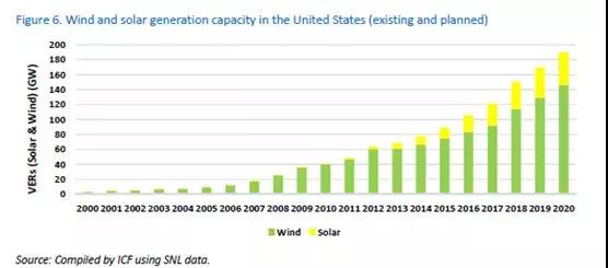 美國(guó)的清潔發(fā)電趨勢(shì)也表明太陽(yáng)能和風(fēng)能等VER的發(fā)電量增加。2016年,風(fēng)能和太陽(yáng)能占總發(fā)電量的近7%。從2001年到2016年,VERs的清潔能源發(fā)電量從7,280 GWh增加到近263,626 GWh,過(guò)去15年的平均年增長(zhǎng)率為27%。隨著太陽(yáng)能和風(fēng)能項(xiàng)目的計(jì)劃能力正在籌備中,預(yù)計(jì)這種趨勢(shì)在不久的將來(lái)會(huì)增加。將來(lái),VERs的輸出削減也可能成為一個(gè)尖銳的問(wèn)題,因?yàn)樵谳p載條件下或由于傳輸限制而導(dǎo)致輸電線路過(guò)載可能會(huì)產(chǎn)生過(guò)度關(guān)注。如VERs的滲透率在電網(wǎng)上增加,額外的系統(tǒng)靈活性和基本可靠性服務(wù)要求也將增加。