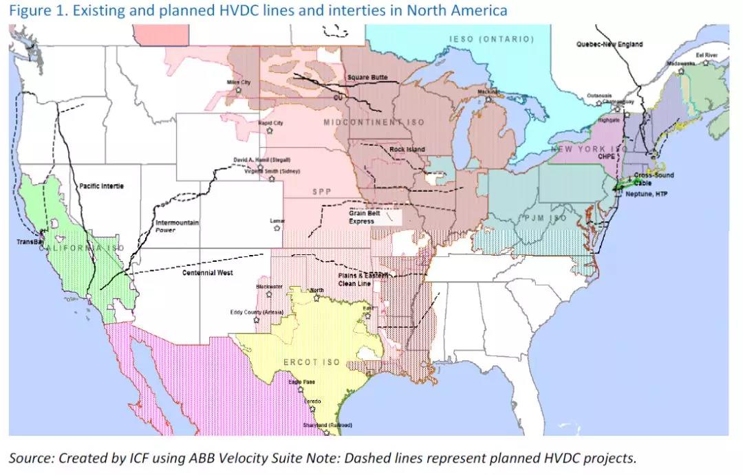 圖1.北美現(xiàn)有和計(jì)劃的HVDC線路。資料來(lái)源:由ICF使用ABB Velocity Suite創(chuàng)建注:虛線表示計(jì)劃的HVDC項(xiàng)目。