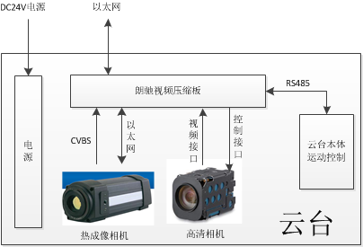 整個云臺通過以太網與機器人主控電腦連接,主控制器通過網絡對紅外熱成像、高清相機和云臺運動進行控制。熱成像輸出CVBS模擬視頻和高清相機數字視頻通過視頻壓縮板進行H264編碼壓縮,再傳輸到主控電腦。熱成像測溫數據通過以太網接穿透視頻壓縮板直達主控制器,向主控制器提供每秒多幀的全屏測溫數據、最高最低溫信息,同時也根據被測溫設備特性從主控制獲取輻射率、距離、區(qū)域信息等,結合機器人的精確預置位能力,可以有效保證測溫的準確性和多次測溫數據的數據可對比性。