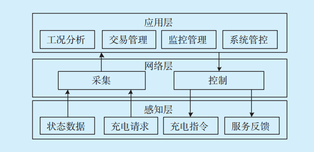 1)感知層:上行方向以系統(tǒng)的前端設(shè)備作為媒介采集電動(dòng)汽車充電接口類型數(shù)據(jù)、電池?cái)?shù)據(jù)狀態(tài)、充電所需時(shí)間、充電樁運(yùn)行狀態(tài)等服務(wù)基礎(chǔ)數(shù)據(jù),并采集用戶的充電服務(wù)請(qǐng)求,包括充電預(yù)約及充電模式等請(qǐng)求指令。下行方向接收系統(tǒng)的充電服務(wù)控制指令、充電服務(wù)指標(biāo)反饋等信息。