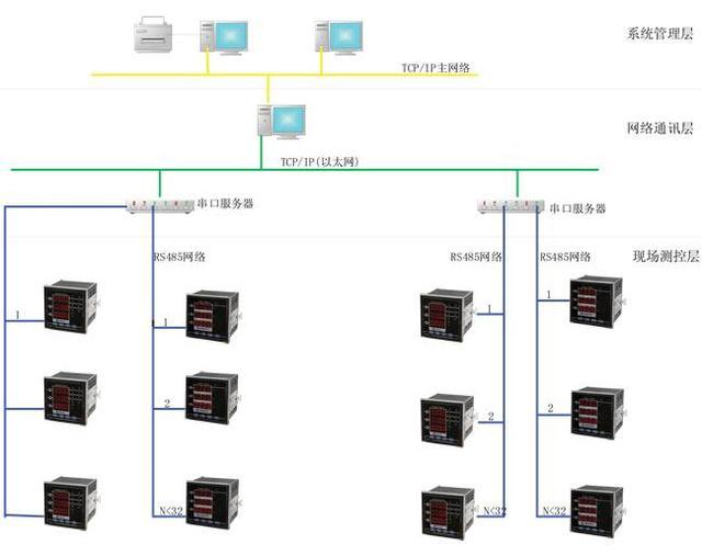 系統(tǒng)支持運行TCP/IP網(wǎng)絡協(xié)議的局域網(wǎng)拓撲結構,可把現(xiàn)場分成多個站點,每個站點配置相應的串口服務器,主站配置歷史數(shù)據(jù)庫服務器、報警服務器等,形成真正的分布式系統(tǒng)。既提高的整個系統(tǒng)的容量和可靠性,又增強了系統(tǒng)數(shù)據(jù)采集的效率。