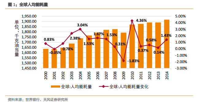 全球能源需求增長緩慢,能源轉(zhuǎn)型推動新能源快速發(fā)展,能源消費(fèi)結(jié)構(gòu)清潔化趨勢明顯。近年來,全球經(jīng)濟(jì)增速進(jìn)一步放緩,主要經(jīng)濟(jì)體走勢分化,發(fā)達(dá)國家經(jīng)濟(jì)緩慢復(fù)蘇,新興經(jīng)濟(jì)體國家經(jīng)濟(jì)發(fā)展有所改善。人均能耗量在2014年達(dá)到了1919.43千克油當(dāng)量,較2000年的1636.60千克油當(dāng)量上升了17.28%。但是從2004年以來,除了2010年人均能耗量出現(xiàn)增加外,人均能耗呈現(xiàn)增速放緩的狀態(tài),。自2010年以來,全球人均能耗量增速從4.36%明顯下降至1.43%并保持穩(wěn)定。
