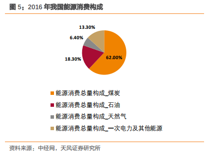 傳統(tǒng)能源消費(fèi)比重下降,清潔能源需求穩(wěn)步增加。我國能源的消費(fèi)需求正更多依賴可再生能源、天然氣和電力,煤炭和石油需求則有所回落。截至2016年,我國能源消費(fèi)構(gòu)成中,