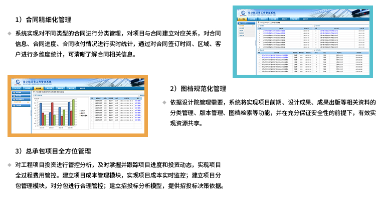 以設(shè)計院日常工作開展業(yè)務(wù)需求為依據(jù),以提升管理效率和效益為根本,建設(shè)覆蓋個人工作管理、合同管理、項目管理、圖檔管理的一體化工作管理平臺,實現(xiàn)企業(yè)內(nèi)部快速、通暢的信息化傳遞和精密化合作,強化企業(yè)歷史資料數(shù)據(jù)的管理與利用,提升項目成本控制水平。
