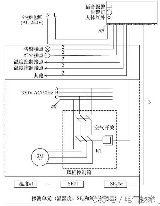 SF6泄漏檢測的核心感應元件是SF6傳感器和氧氣傳感器,由高性能的嵌入式微控制器和放大器構成信號處理單元。根據氣體的性狀及泄漏特征,SF6和氧氣監(jiān)測單元分布安裝于SF6開關下方離地面約10cm地方,主機通過網絡將監(jiān)測到的實時數據傳送至控制室計算機進行動態(tài)監(jiān)控,當監(jiān)測到有SF6氣體泄漏時,系統(tǒng)自動開啟風機排風,具有10m長距離人體紅外探測、語音提示和高頻笛音報警、光報警、定時或超限觸發(fā)或強制風機起/停操作等功能。SF6泄漏報警系統(tǒng)原理如圖3所示。