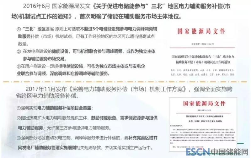 宏觀層面,國家在2016年和2017年分別出臺了兩個(gè)文件,分別為《關(guān)于促進(jìn)電儲能參與“三北”地區(qū)電力輔助服務(wù)補(bǔ)償(市場)機(jī)制試點(diǎn)工作的通知》和《完善電力輔助服務(wù)補(bǔ)償(市場)機(jī)制工作方案》,明確了儲能在輔助服務(wù)市場的主體地位,全面實(shí)施跨省跨區(qū)電力輔助服務(wù)補(bǔ)償。