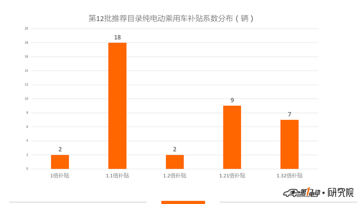 綜合以上,本批目錄38款純電動(dòng)乘用車中,按1倍系數(shù)補(bǔ)貼的車有2款,按1.1倍系數(shù)補(bǔ)貼的有18款,按1*1.2=1.2倍系數(shù)補(bǔ)貼的有2款,按1.1*1.1=1.21倍系數(shù)補(bǔ)貼的有9款,按1.1*1.2=1.32倍系數(shù)補(bǔ)貼的有7款。