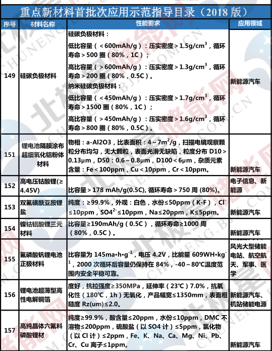 工信部近日公布《重點(diǎn)新材料首批次應(yīng)用示范指導(dǎo)目錄(2018年版)》,其中包含鎳鈷鋁酸鋰三元材料、氟磷酸釩鋰電池正極材料、硅碳負(fù)極材料、鋰離子電池?zé)o紡布陶瓷隔膜、鋰電池隔膜涂布超細(xì)氧化鋁粉體材料等。