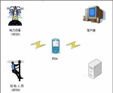 基于上述構架而設計的智能電網的系統(tǒng)結構圖如圖2所示,其中電力設備與巡檢人員及覆蓋在其上的電子標簽屬于感知層,PDA手持計算設備屬于解析層,客戶端PC與服務器對應系統(tǒng)的應用層和數(shù)據(jù)層。