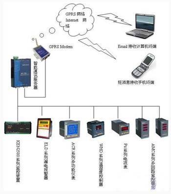 基于GPRS箱變遠(yuǎn)程監(jiān)控系統(tǒng)采用三層網(wǎng)絡(luò)結(jié)構(gòu),如圖2所示,即現(xiàn)場層、通訊層、管理層?,F(xiàn)場層主要由智能儀表組成主要完成箱變內(nèi)部電量與非電量的數(shù)據(jù)采集;通訊層主要由智能通訊服務(wù)器、GPRS MODEM組成,主要實現(xiàn)現(xiàn)場數(shù)據(jù)的集中采集和通訊管理;管理層不設(shè)監(jiān)控中心,主要由移動數(shù)據(jù)終端(用戶手機(jī)、email郵箱等)組成,主要用于接收箱變內(nèi)部運(yùn)行數(shù)據(jù);系統(tǒng)借助于移動的GPRS網(wǎng)絡(luò)實現(xiàn)數(shù)據(jù)的遠(yuǎn)程采集和管理。