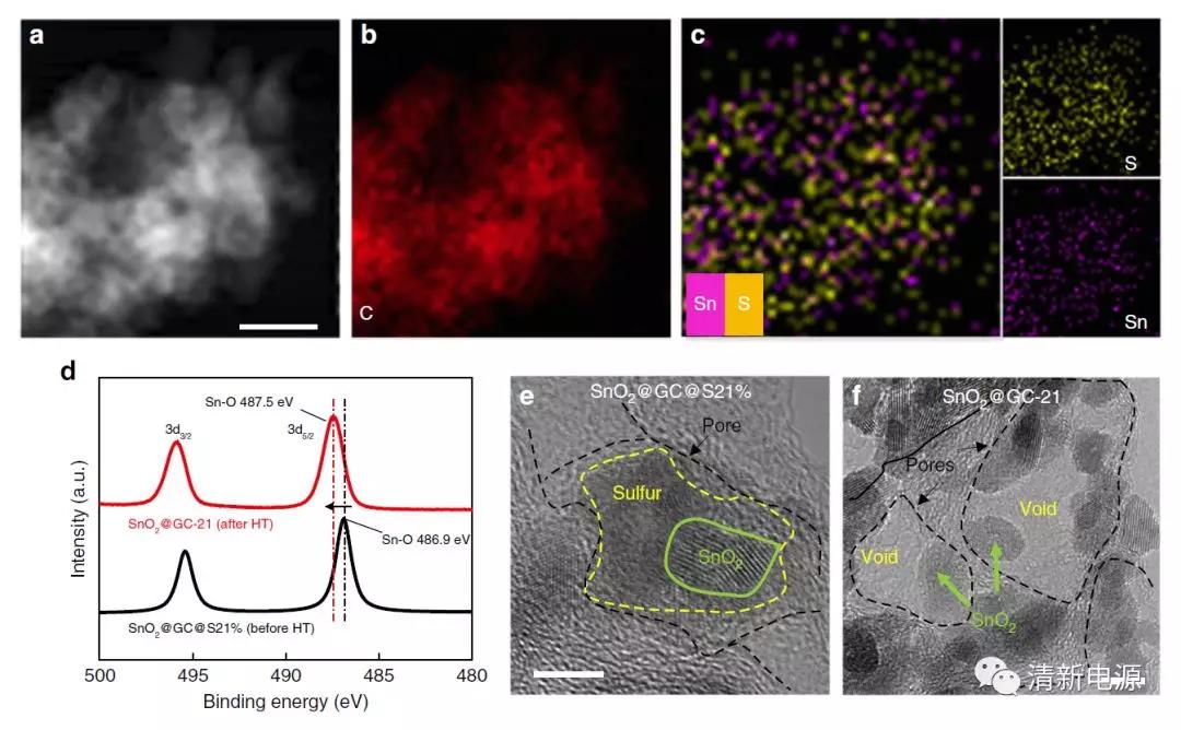 圖2 硫模板的特點(diǎn)。(a-c)硫與SnO2的相間分布狀態(tài);(d)XPS表征硫與SnO2間的相互作用;(e)HRTEM表征硫?qū)nO2的緊密包裹;(f)擁有合適預(yù)留空間的碳籠結(jié)構(gòu)對(duì)SnO2顆粒的限域。