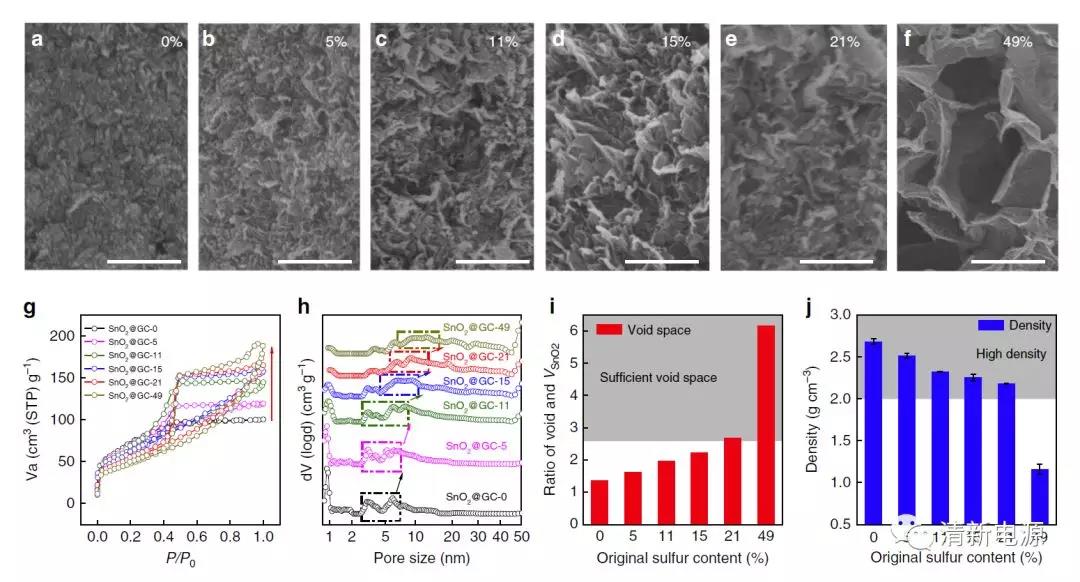 圖3 硫模板法對(duì)預(yù)留空間的精確調(diào)控。(a-f)SEM表征硫模板使用量的增加,三維石墨烯網(wǎng)絡(luò)結(jié)構(gòu)的變化;(g-h)氮?dú)馕摳奖碚魇┚W(wǎng)絡(luò)的孔隙變化;(i-j)二氧化錫/石墨烯復(fù)合結(jié)構(gòu)內(nèi)部預(yù)留空間和密度的變化。