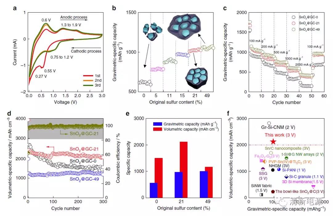 電化學(xué)表征顯示,隨著石墨烯籠內(nèi)部預(yù)留空間的增加,二氧化錫/石墨烯復(fù)合電極材料的質(zhì)量比容量逐漸提高,當(dāng)預(yù)留空間超過260%之后,達(dá)到峰值,不再隨預(yù)留空間的增加而進(jìn)一步增加,證明硫模板使用量為21%時(shí),可以引入合適的預(yù)留空間來保證二氧化錫容量最大程度的發(fā)揮。合適的預(yù)留空間不僅能夠保證快速的鋰離子傳輸,從而在充放電速率加快的條件下,二氧化錫/石墨烯復(fù)合電極材料依然可以貢獻(xiàn)較高的質(zhì)量比容量,同時(shí)能夠在多次充放電循環(huán)中保證整個(gè)電極材料結(jié)構(gòu)的穩(wěn)定,始終保證穩(wěn)定的容量輸出(循環(huán)300圈,依然可以貢獻(xiàn)974 mAh g-1的質(zhì)量比容量)。更為重要的是,因?yàn)槎趸a/石墨烯復(fù)合電極材料的高密度,整個(gè)電極材料可以貢獻(xiàn)極高的體積比容量(2123 mAh cm-3),該值為目前錫碳、硅碳等復(fù)合電極材料體積比容量的最高值之一;而基于整個(gè)電極也可以貢獻(xiàn)1075 mAh cm-3的體積比容量。