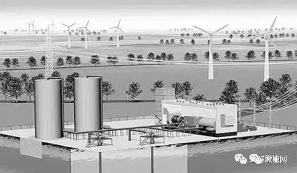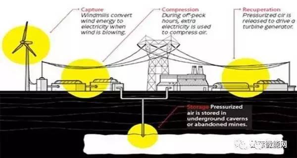 壓縮空氣儲(chǔ)能采用空氣作為能量的載體,大型的壓縮空氣儲(chǔ)能利用過(guò)剩電力將空氣壓縮并儲(chǔ)存在一個(gè)地下的結(jié)構(gòu)(如地下洞穴),當(dāng)需要時(shí)再將壓縮空氣與天然氣混合,燃燒膨脹以推動(dòng)燃?xì)廨啓C(jī)發(fā)電。