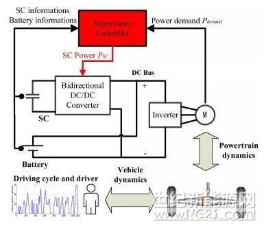 如上圖所示,半主動HESS控制系統(tǒng)由幾個子系統(tǒng)組成:驅動程序、電池組、超級電容器、DC/DC變換器、電機、控制器和汽車底盤。在能量管理算法中,雙向DC/DC轉換器對直流母線總線進行電壓變換,這是我們所在系統(tǒng)的唯一優(yōu)化執(zhí)行器。高優(yōu)先級控制器負責收集超級電容器、電池和功率鏈的信息,計算超級電容器的功率需求,并通過DC/DC轉換器控制超級電容器的功率?;旌夏茉磧Υ嫦到y(tǒng)的特點在于電池被動地連接到直流母線上,根據(jù)不同的能量鏈儲能放能。而系統(tǒng)中的監(jiān)控器實現(xiàn)了電池和SC包之間的功率分配。